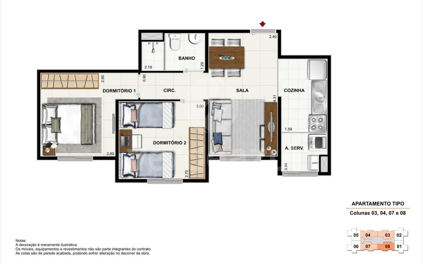 Apartamento possui 2 quarto,1 banheiro, 1 armário de cozinha, area de serviço, e vaga de garagem