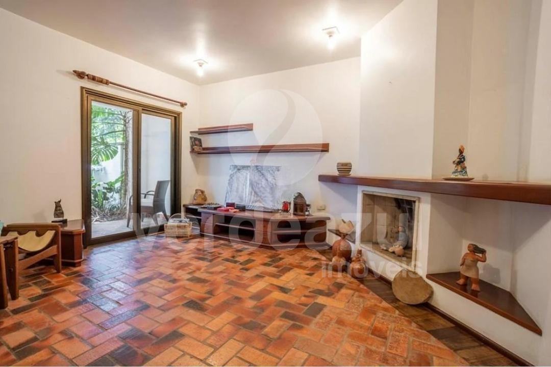 Sala de TV com lareira e varanda, perfeita para momentos aconchegantes.