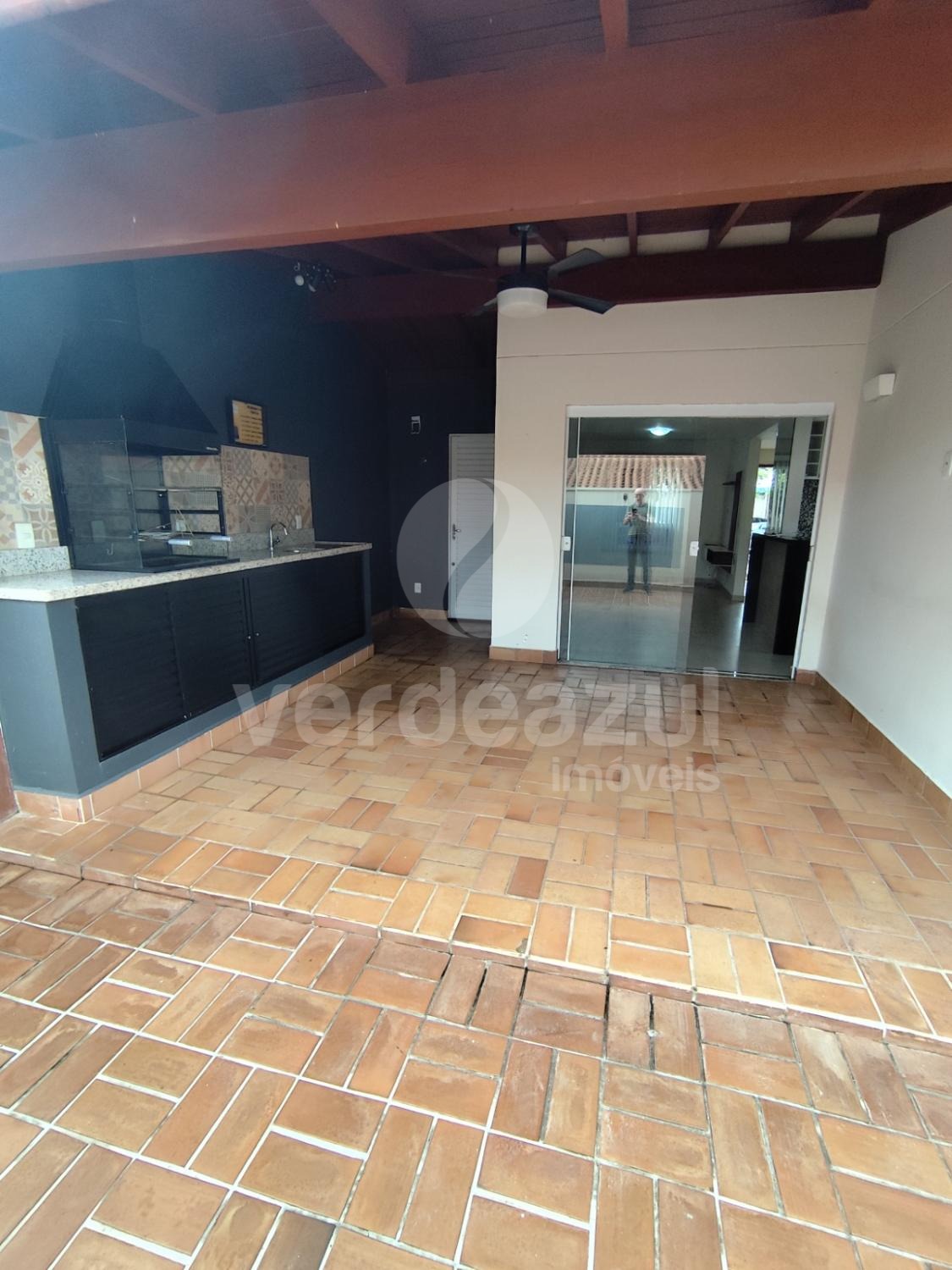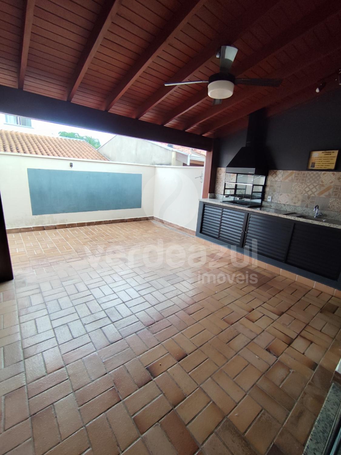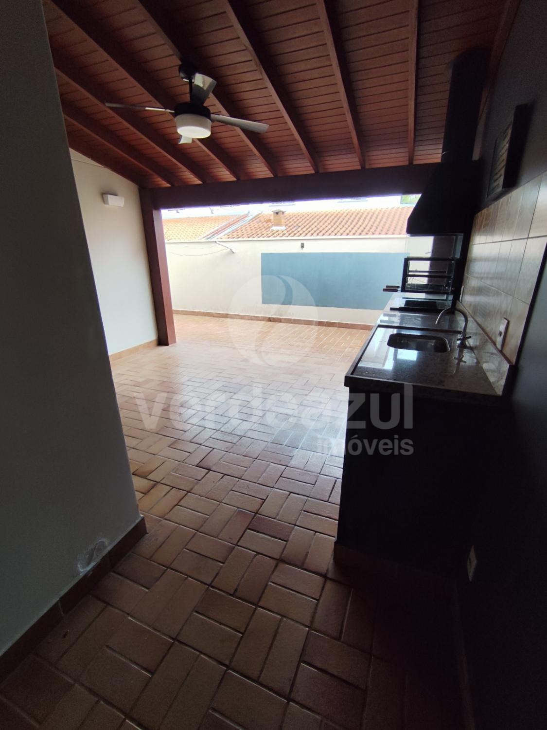 Terraço com churrasqueira, pia e armário.