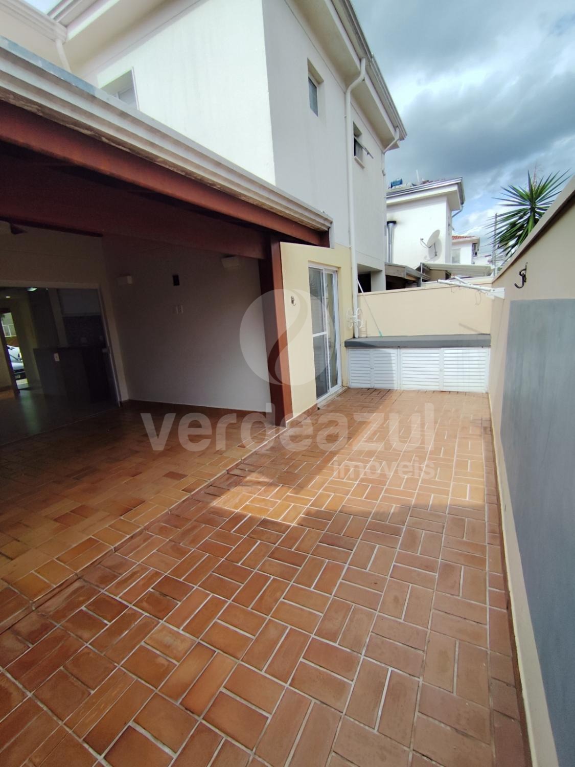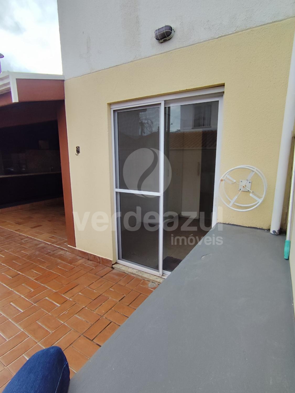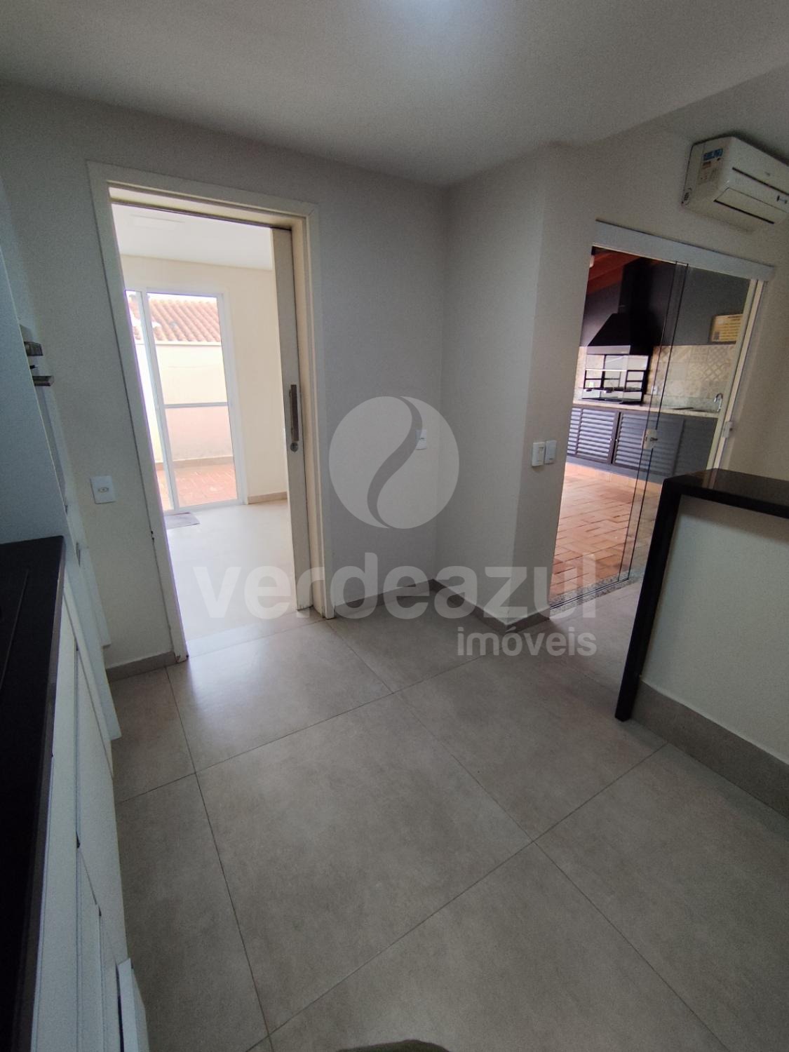 Terraço com churrasqueira, pia e armário.