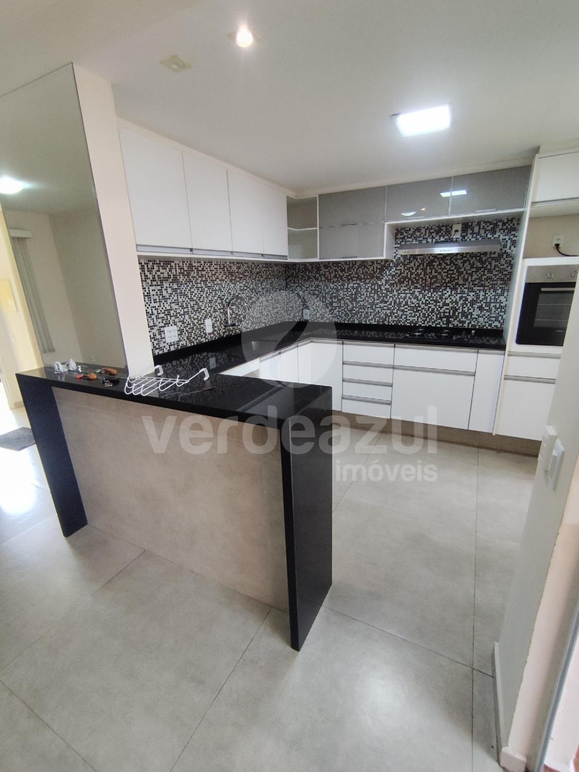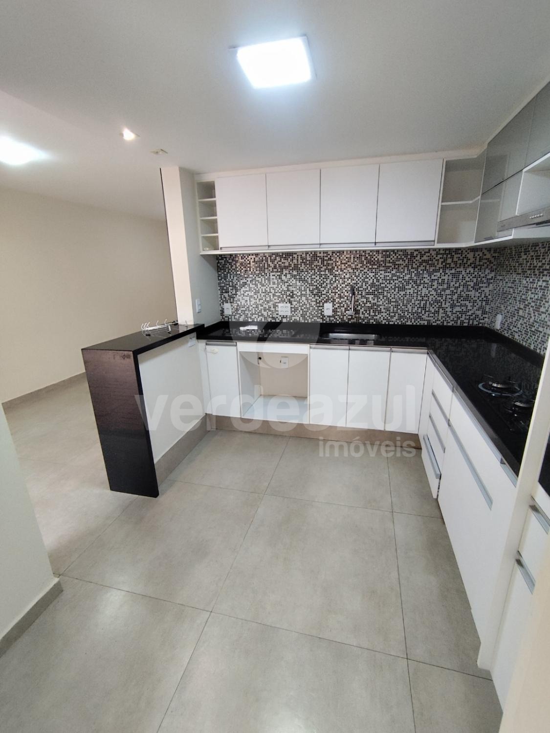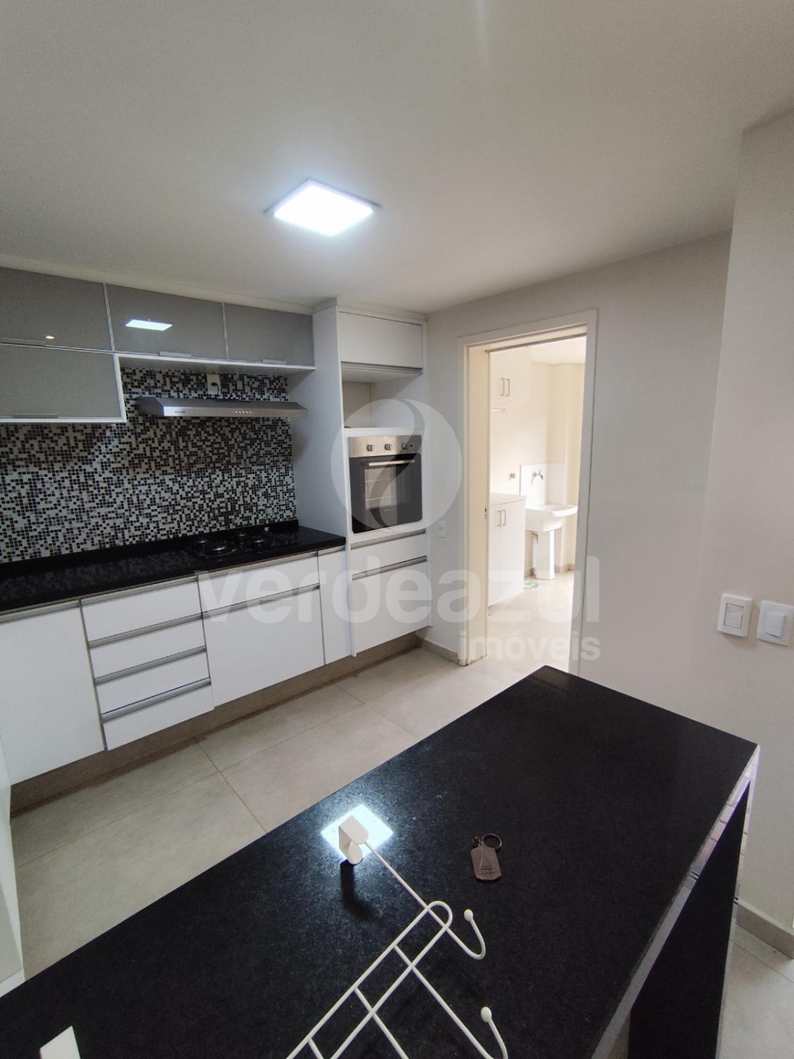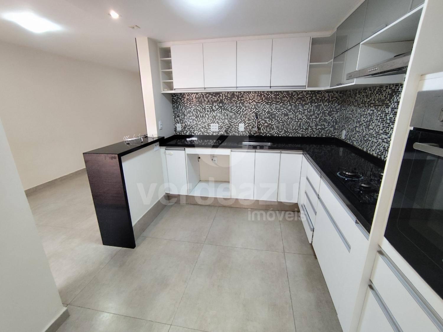 Cozinha estendida, maior que o padrão, com armários planejados, cooktop e forno elétrico.