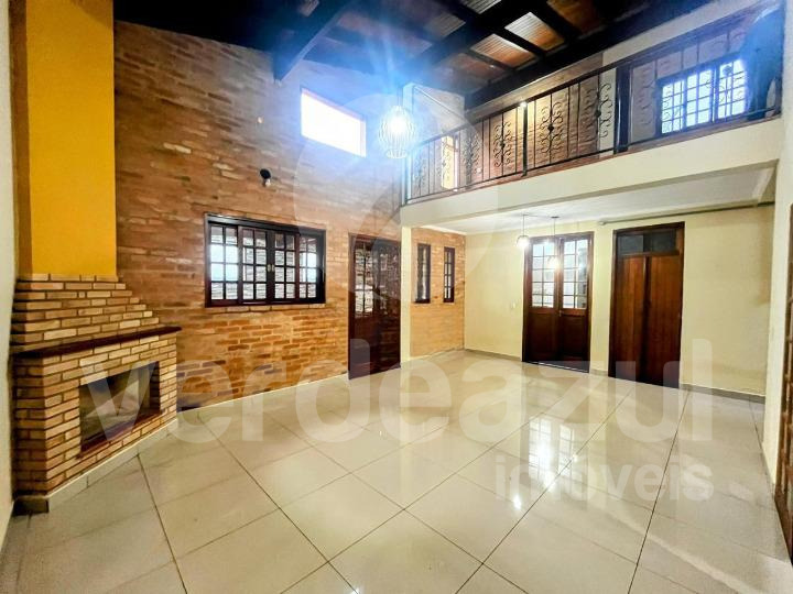 Living dois ambientes com lareira, banheiro social, sala de TV, escritório, cozinha planejada e lavanderia.